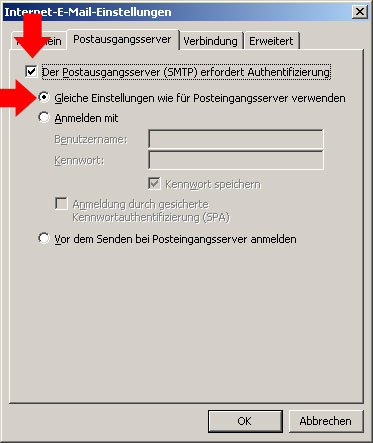 Auf der Seite Postausgangsserver muß die Option "Postausgangsserver erfordert Authentifizierung" ausgewählt werden, da sonst keine E-Mails verschickt werden können. Zur Authentifizierung wird die selbe Benutzername/Passwort Kombination benutzt wie schon beim Mailempfang. Daher kann hier "Gleiche Einstellungen wie für den Posteingangsserver verwenden" ausgeählt werden. |