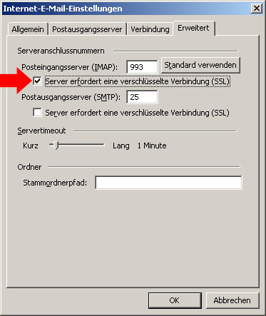 Unter dem letzten Karteireiter "Erweitert" befindet sich eine optionale Einstellung, die allerdings ausschließlich für IMAP möglich ist. Da bei IMAP die Emails auf dem Server verbleiben und dadurch mehrmals auf Ihren PC übertragen werden gibt es hier die Möglichkeit diese Verbindung zu verschlüsseln. Hierzu einfach den Haken bei der Option setzen. Ob die Verschlüsselung benutzt werden soll bleibt Ihnen überlassen, beider Möglichkeiten stehen zur Verfügung. Wenn die Verschlüsselung ausgewählt wird, und sie unsere Stammzertifikat noch nicht installiert haben (-> FAQ) wird bei jedem Verbindungsaufbau ein Abfrage gestartet, ob Sie diesem Zertifikat vertrauen wollen. Diese können Sie mit "Ja" beantworten. Wir empfehlen allerdings das Stammzertifikat zu installieren. |