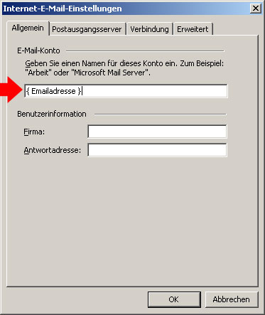 Auf der Hauptseite des nun geöffneten Dialogs kann ein beliebiger Kontoname für das soeben angelegte Konto vergeben werden. Zu empfehlen ist hierbei als Name die E-Mail-Adresse einzutragen, da so bei mehreren Konten die Übersicht nicht verloren geht. Standardmäßig wird von Outlook hier der Mailserver eingetragen. |