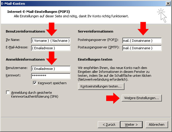 Im nun folgenden zentralen Dialog des Assistenten müssen sowohl Ihre persönlichen Daten, als auch die Daten für Ihren Email-Zugang eingegeben werden. Hierbei macht die Auswahl IMAP/POP3 keinen Unterschied. Im Feld "Ihr Name" kann eine beliebige Zeichenfolge eingeben werden. Im Feld "E-Mail-Adresse" sollte die einzurichtende Adresse eingetragen werden. Als Servernamen wird jeweils "mail.compcom.de" eingetragen. Benutzername ist wieder die vollständige E-Mail-Adresse (z.B. info@edv-rosenthal.de). Das Kennwort haben Sie beim anlegen der Adresse selbst vergeben. Damit der Versand auch klappt müssen jetzt noch "Weitere Einstellungen" vorgenommen werden. |