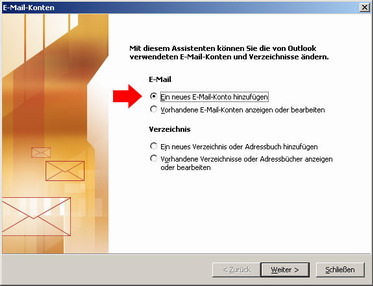 Zum Anlegen eines neuen Emailkontos in Microsoft Outlook 2003© wählt man unter "Extras" den Menüpunkt "Email-Konten". Danach öffnet sich dieser Dialog, in dem man ein neues Konto anlegen kann. |